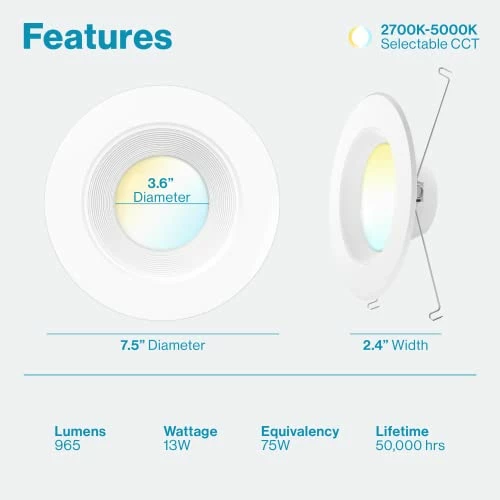 - β SELECTABLE CCT – Choose color temperature (2700K, 3000K, 3500K, 4000K, 5000K) to tune your 5/6β Retrofit downlight to your preferred color setting. Easy CCT selection with the slider switch on back. During installation, try various color temperatures to change the light quality then lock in your selection. β DIMMABLE – Seamless dimming capabilities (100%-10%) to fit any mood or dΓ©cor.