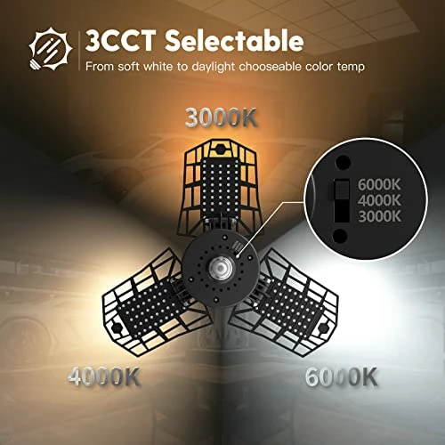 - 3CCT: 3 color temperature selectable(3000K-warm white;4000K-cool white;6000K-cool daylight white), can be applied to more scenarios, meet different lighting needs, more than a garage light!