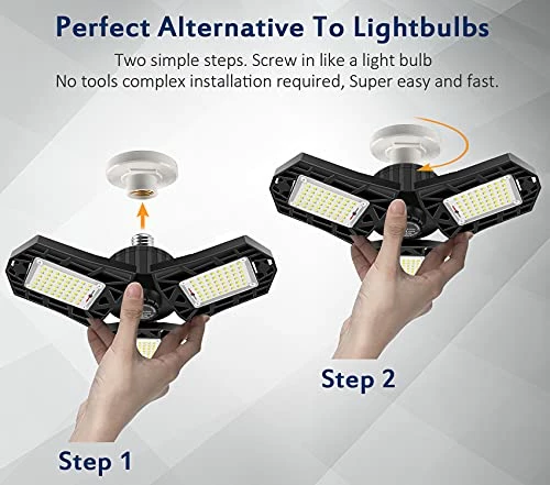- γHumanized Adjustable DesignγUnique wide-angle garage lighting design with three 90 degree adjustable multi-position panels, which can have a perfect garage lighting distribution curve according to your application, this will make the light cover 360Β° area.