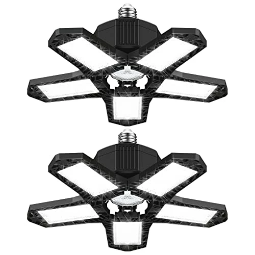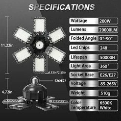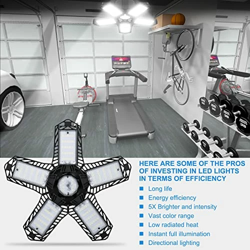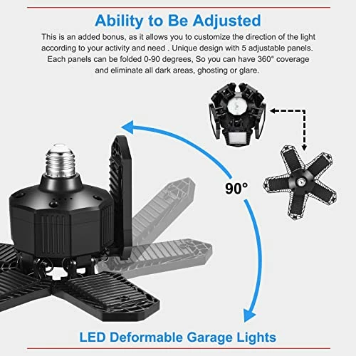 - γLED Work Shop Light Cover 360Β° AreaγWith 5 ultra bright adjustable LED heads, unique wide angle LED adjustable light design, each wing 90 degree adjustable, which can have a perfect garage lighting distribution curve according to your application, this will make the light cover 360Β° area, lumens flux up to 12000LM, defeat the darkness.