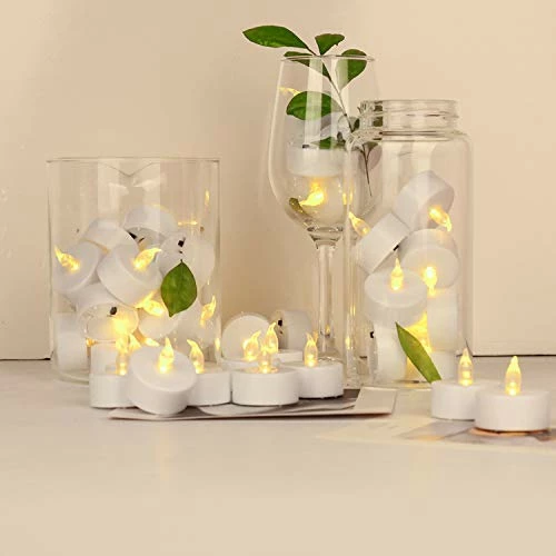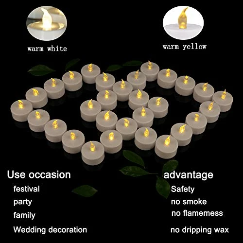 - ?CREATE AMBIENCE – The warm yellow flameless LED tea lights candles flicker and provide the effect of an actual candle ,Flameless Candles to Create a Warm Ambiance, perfect for decorating weddings, parties, gardens, patios, decks, restaurants, lanterns, kids projects, centerpieces ,Valentine’s day decoration,Halloween Decoration,Diwali Decoration,Easter decoration, Various holiday decorationsetc.Prayer candle,Mother’s day gift,Easter party,Memorial Day