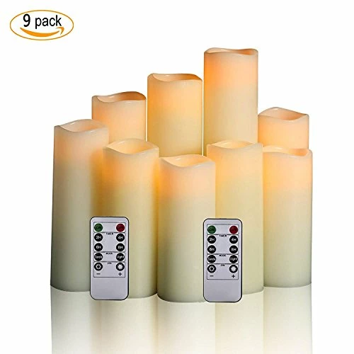 - A BEAUTIFUL DECORATION FOR EVERY HOME: The premium flameless candle lights set includes 9 real wax pillar candles, two 4″, two 5″, two 6″, a 7″, a 8″, a 9″ height with 2.2″ thick candles and two remote controls. Their ivory color and elegant design is the perfect fit for any space, and will complement any style of decoration in a wonderful way!