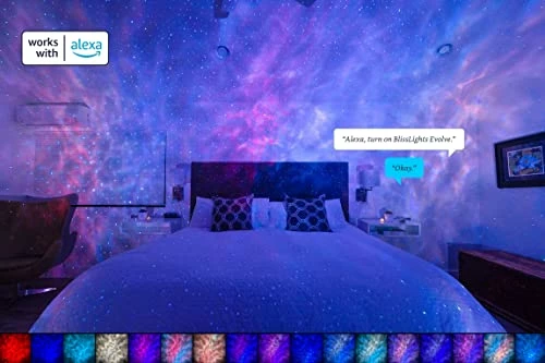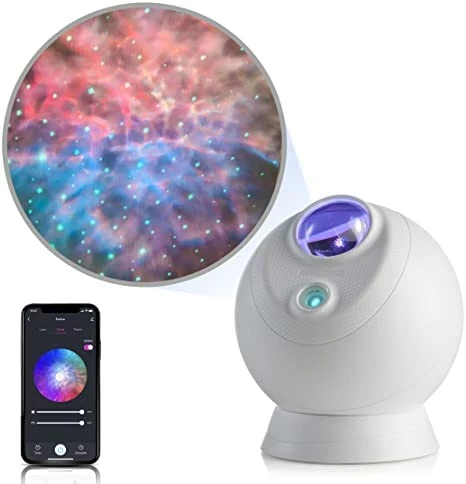 I bought this for my 8 yo who had a renewed fear of the dark suddenly with night wakings, including waking us up in the middle of the night for 3 nights in a row (which is nothing compared to the 9 months of night wakings at 2 to 5 times a night a few years ago, but I didn’t want a repeat!). We chose a projector because she already had the Moon night light with LED rainbow colors. What helped my kid last time with overcoming fear of the dark was changing the night light, so, this time, I went up a step to a projector. The light show you see upon plugging-in the Bliss Evolve with nebula clouds and stars is awesome – it’s magenta-blue-violet nebula clouds with blue stars. The set up to connect my phone to the projector to use the ap to adjust the colors did take up a bunch of my time, like 45 min to an hour, — maybe someone with lots of tech experience it would not take so long. I downloaded the ap from the QR code on the box. The manual is a QR code on the box, and does not mention any of the ap programming – (some of us like instructions). The ap does walk you through what to do to connect to the projector, and after 45 min or more we were all excited when I got my phone to link to the projector and my kid could change the colors and stars. There are a few “cloud” options: Sky, Ocean and… Space (?) or something. They are all beautiful. Then, upon my kid’s first night using the Bliss Evolve as a projector, I got woken up in the middle of the night because IT SHUT OFF ON ITS OWN and my kid woke up to DARK!!! – probably has a built in shut off time. In the ap, there is a scheduler, and I set up every night for the projector to automatically go on at our hour of bedtime, AND I set up a scheduler for it to automatically turn off through morning wake up at 6am. I was worried that it would just auto-shut off again, but it doesn’t if you set up a turn on and shut off schedule in the ap. TOTALLY HAPPY! Our patience with figuring out the ap over two days and two nights paid off! Whew! Now when our kid wakes up in the middle of the night, the beautiful sky is comforting. The manual could be improved with some details about how the ap can assist you – to allow parents like me to get our well deserved sleep! But totally the product is doing the trick keeping my kid in bed. Thank you!