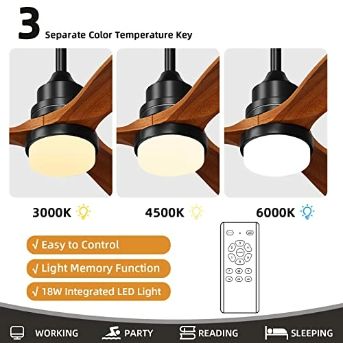 - β Adjustable LED Light: Indoor ceiling fan with light, acrylic shade, 1800 lumens, 22W, energy saving and long life color temperature, from warm white (3000K) to natural light (4000K) to cool white (6000K). Dinner with family in soft light.