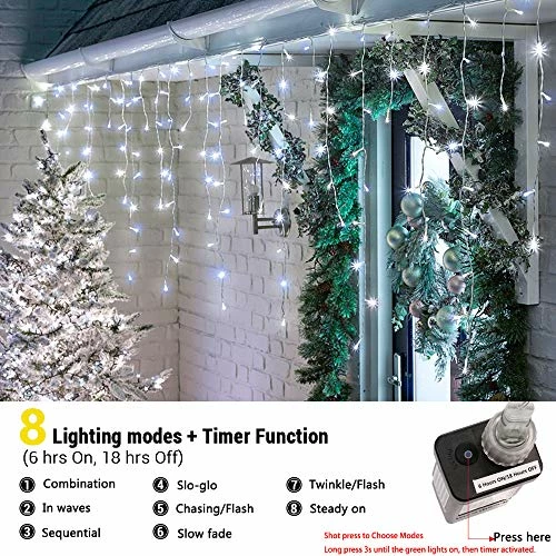 - Timer & Easy to Operated: There is a button on the adapter, short press to choose mode, and long press 3s until the green lights on, then timer is activated. The icicle lights will 6 hrs on and 18 hrs off automatically.