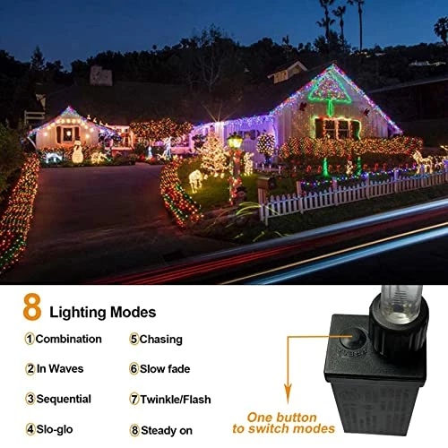 - ใFun 8 Lighting Modes &TimerใBy pressing the button on the plug, you can switch the outdoor christmas lights between 8 lighting modes:ย Combination,In Waves,Sequential,Slo-Glo,Chasing/Flash,Slow Fade,Twinkle/Flash and steady onย to suit different atmospheres and cast a warm and inviting glow, for indoor and outdoor use. Pressing the button on the plug for 3s, you can set timer function for 8H on and 16H off,so you wonโt have to physically go out and switch them on every evening.