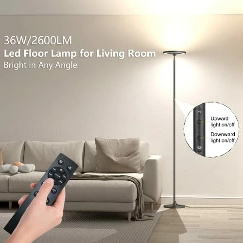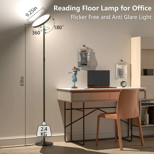 - Evenly lights, caring eyes:36W 2600 lumens floor lamp for bedroom, bright but not harsh, the 69in height avoids staring at the light directly. The lighted surface can be rotated through 350 degrees, you can adjust any angle you need. Soft , non-flickering light offer you a cozy experience.