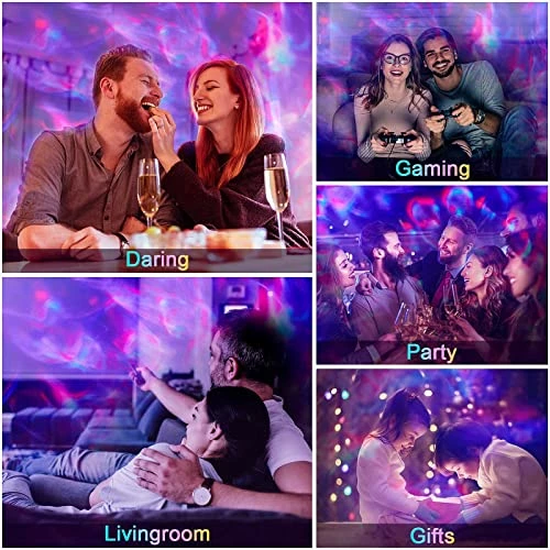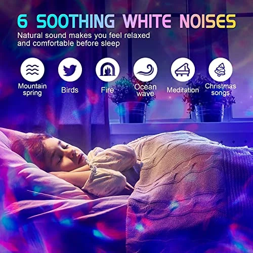 - White Noise Star Light Projector for Bedroom: White Noise Ocean Galaxy Light Projector creates stunning cosmic spaces and vast ocean worlds throughout your bedroom. Galaxy projector for bedroom, has 6 built-in lossless white noise music; The sound of clear mountain springs running/country morning birdsong/fireplace burning/ocean waves lapping/meditative piano music/joyful Christmas songs.