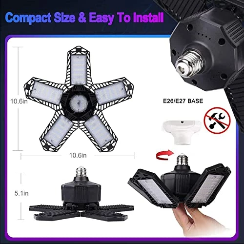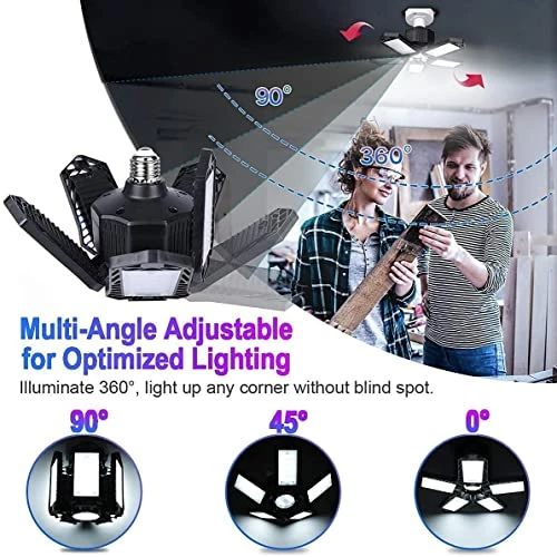 - 【Easy Installation Like Bulbs into E26/E27 Base】 The installation of this deformable Garage Ceiling Light is very convenient, preparing an E27/E26 ceiling socket, no need any tools, wiring or even hiring expert electricians. just screw this garage light into the ordinary lamp holder. Few seconds work. Saves a lot time for you.