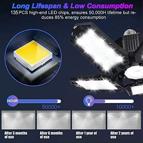 - 【High-end Garage Light LED Chip & 85% Energy Saving】 10000 lumens 6500k daylight, this garage light generates a steady and super bright lighting, no glare or dim brightness. CRI 80+ of the light, let everything in a natural look like under daylight. With 135Pcs high-end beads, SMD 2835 high efficiency Chips, saves 85% energy for your garage. Higher light efficiency, lower power consumption, more energy savings, then cut down your cost.
