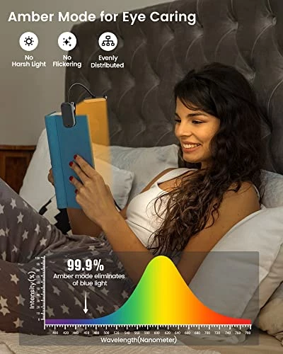 - [Amber Light Protects Your Eyes] Lots of bookworms enjoy reading before sleep, which is why we designed this book light with 1800k amber mode. The 1800k provides superb eye protection and prevents you from eye strain even after a long read. It blocks 99.99% blue light for a peaceful & sweet sleep. No harsh light, no flickering, no dazzling. You deserve this amber book light for relaxing bed reading time.