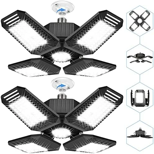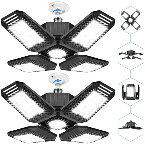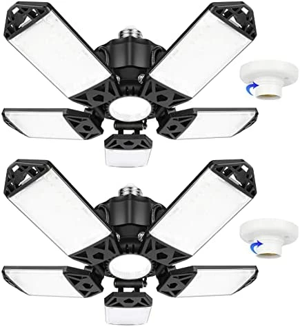 - ✅【Easy To Install & Widely Application】Our 2 Pack LED garage lights works great in E26/E27 standard light socket, which is easy to install as normal bulb without tools or wiring(comes with 2 base and needed screws). Extremely bright lighting makes deformable lamp perfect for garage, warehouse, office, basement, barn,supermarket, station, display area,large area lighting etc.
