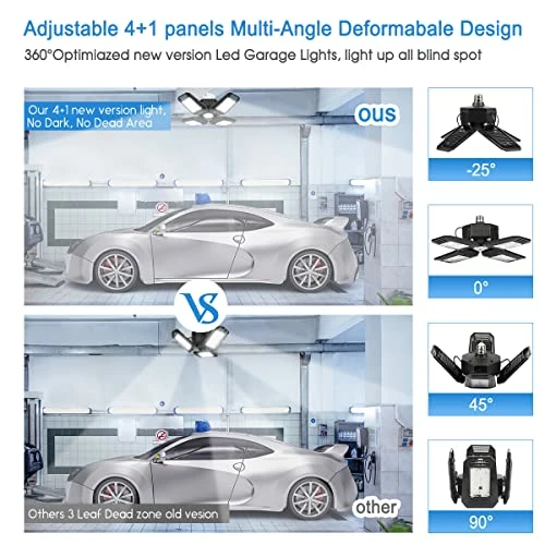 - ✅【Deformable & 360° illumination】Deformable Four-leaf garage light whose panels can be adjusted from 0° to 90°. The adjustable angles made it adjusting where you need. It can cover all the corners which are not covered by normal light bulb, 360° full coverage, No dark.