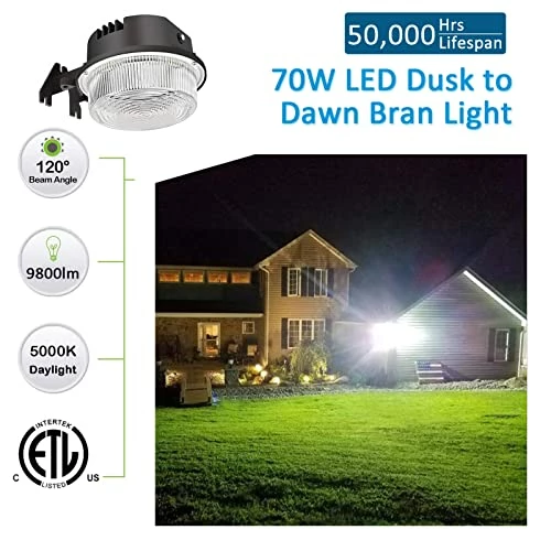 - ? DUSK-TO-DAWN PHOTOCELL & EASIER INSTALLATIONย : This LED outdoor barn Light built-in dusk-to-dawn photocell sensor automatically turns ON at sundown/night and OFF at sunrise/daytime. With AC120-277V input , which makes this yard light more adaptable to a larger application range and cuts down unnecessary wastage caused by voltage instability. It can be fixed on the wall or various types of mounting arms, 82ft x 82ft large light coverage when mounted at 26 feet.