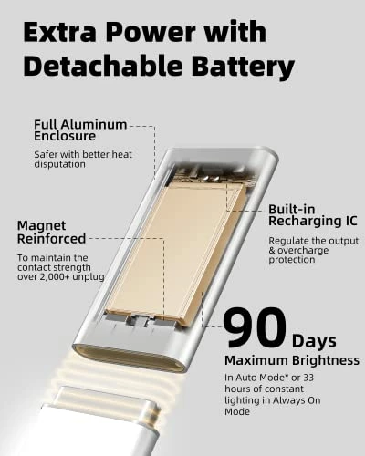 - γHigh-Capacity & Detachable Batteryγ The 1500mAh rechargeable battery can last 90 days in auto mode ( 3 times per day ) or up to 33hr of constant lighting. It also has a detachable design that makes the recharge much more convenient.