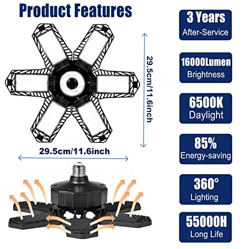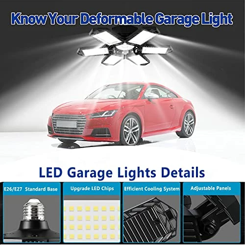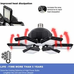 - γ LED Garage Light Bulb Quick Heat Dissipation Safety Use γUpgraded Garage Light Bulb is made of high quality ABS housing and aluminum heatsink, and excellent hollowed-out for heat dissipation high-temperature resistant and corrosion resistant, advanced cooling system. Up to 50,000H lifespan.