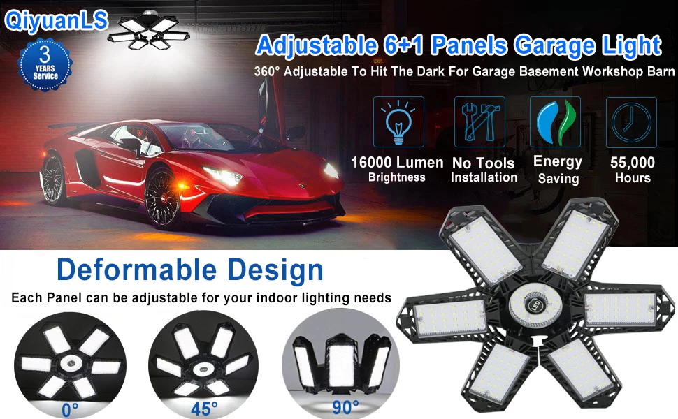- γ Super Bright 160W LED Garage Lights γQiyuanLS LED ceiling lights come with 6+1 adjustable LED panels. 160 watts, CRI85+, 6500 kelvin daylight garage lights feature LED technology with 168 pcs of the high-quality diodes ensuring super bright lights with no dark spaces, flicker or glare.