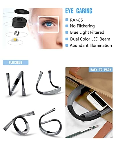 - [Eye Caring & Ergonomic Design] No flickering and blue light filter design with advanced LED beads. No eye strain any more for both kids and adults. The arms are supple and adjustable so you can get the angle most comfortable to you. Ergonomic neck around design, and it is totally hands free!