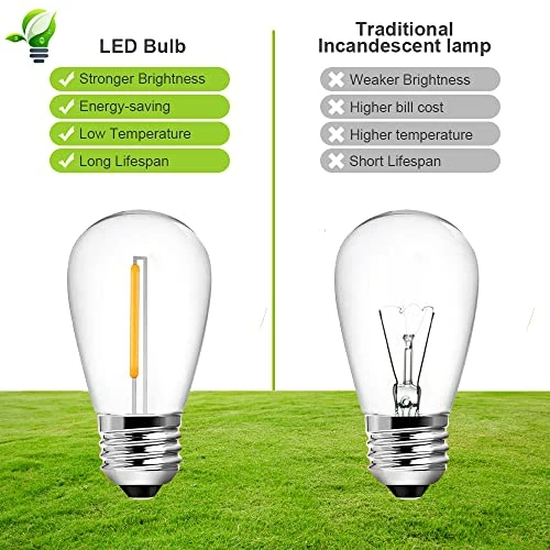 - 4.γConnectable & Easy to installγEquipped with 15pcs E26 socket and 16pcs S14 LED bulbs,the designed waterproof end connector allows link up to 40 strands. Built-in hanging loop is easier for you to set up and transform your outdoor space within a few minutes.