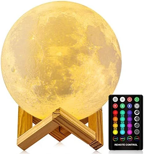 - ?ใ16 COLORS MOON LAMP WITH REMOTE ใThis 4.8 inches moon light displays 16 becautiful colors. All the colors can individually be dimmed as per your preference. Touching the sensor for less than a second enables you to switch between 16-colored light, and for over a second enables you to adjust light brightness, donโt miss any fun about it.