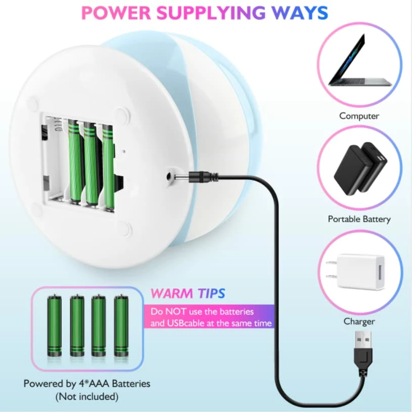 - 360Β° Rotation & 2 Power Ways — Press the rotation button, the night light for kids will be filled with night sky projection on ceiling and walls, 360 degree rotating its base without any noise, provides you a fantastic moving space world or animal world. 2 ways power supply – USB connection or 4*AAA Batteries (Batteries are NOT included).