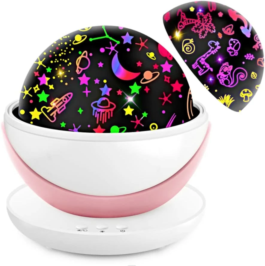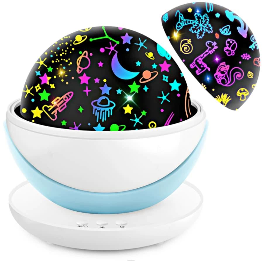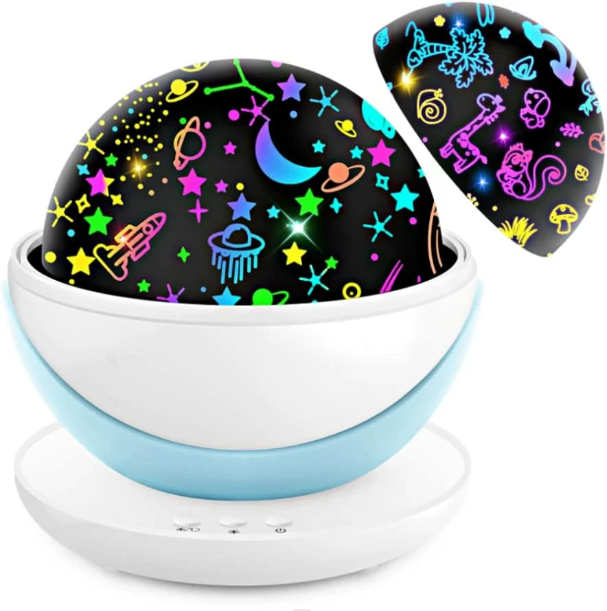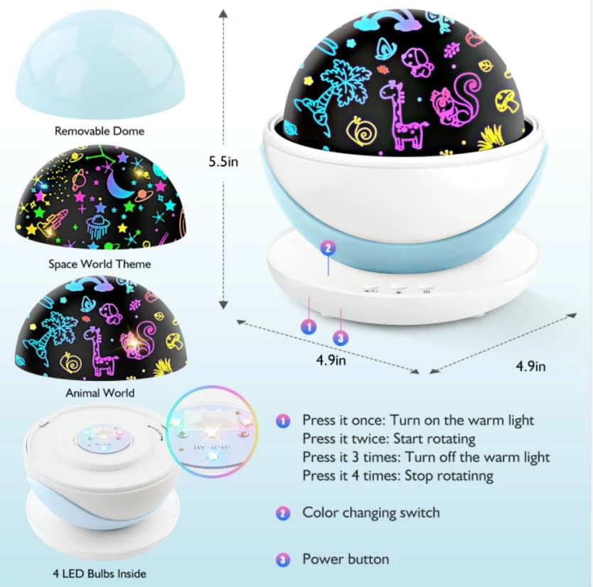 This is a great projector/nightlight! We bought ours in pink for a girl, and she loves it. There are different screens you can use to project different pictures. Our little girl like to use them together to make her own design. Itβs very easy and user-friendly. You can change the colors to many different color schemes. There are You can change the colors to many different color schemes. There are only three buttons, a power button, a color, changing button, and a rotating button. Our little one easily uses this independently. For the price point, I think itβs a very good buy, and would make a very good gift for a little child. Our child likes to watch it at night because the motion while itβs rotating, is soothing and calming to her. We would highly recommend this to anybody!