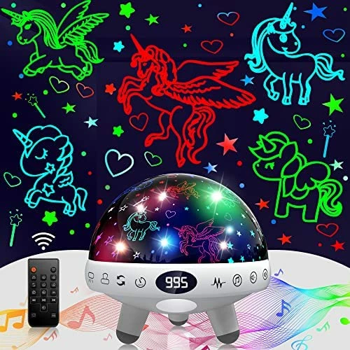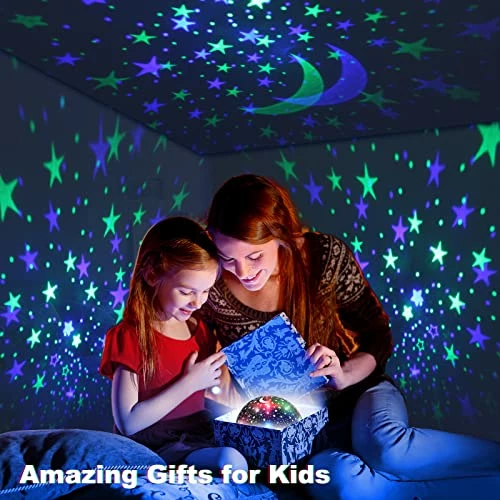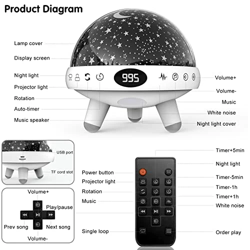 - ใEASY TO USEใYou can use the remote control remotely to turn on/off the baby night light projector , customize the color, brightness, sound, volume, timer and rotation and more. You can also turn off the timer or Set 5-995 minutes timing.When the set time is up, the kids night light will automatically turn off.Parents don’t have to get up after their children fall asleep to turn off the baby star projector night light, which would disturb yours and your kid’s sleep.