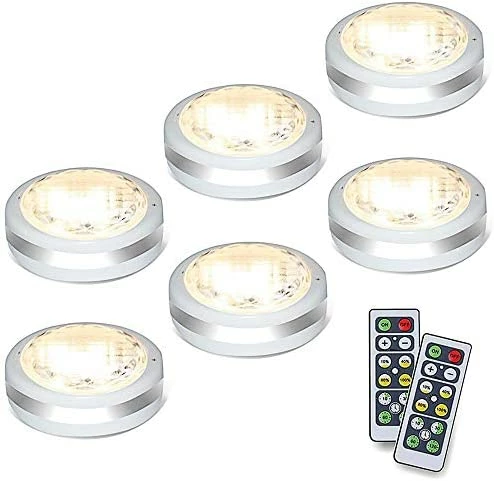 These are really nice for the low price! They are also the size and look I was going for. I took out my ugly medicine cabinet and wanted something to use as a nightlight and to also class up the hole in the wall. These little lights really changed my DIY on an extremely small budget look. They come with two remotes which is great for me because Iβm sure I will lose one. I have only 2 negatives about this product. First, the adhesive is double sided circular foam thin disc (attached picture) and it does seem really strong but will also be very hard to get off the surface, so put it somewhere permanent. Secondly, there is a small space where the plastic cover (over bulbs) and the white outer part and you can see the bulbs. This doesnβt bother me too much because you canβt see it unless looking up close. But these are great puck lights for an extremely great value (6 lights and 2 remotes).