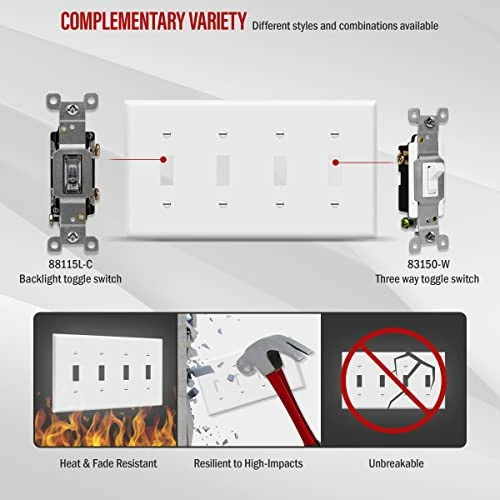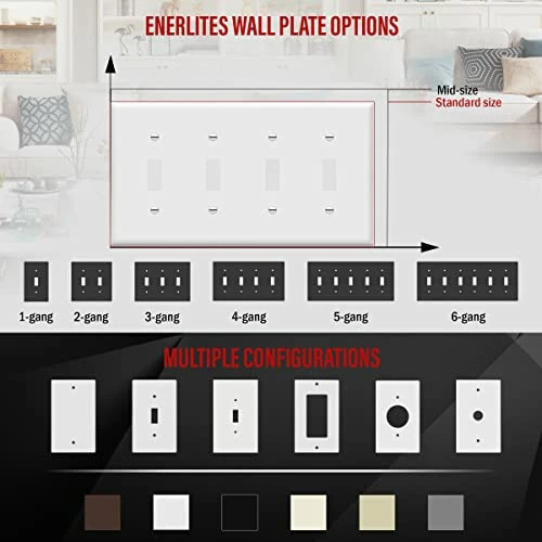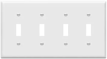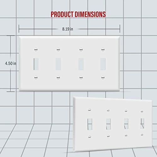 - Easy replacement of any 4-gang wall plate of the same configuration; standard size dimensions: 4.5″ height x 8.19″ length