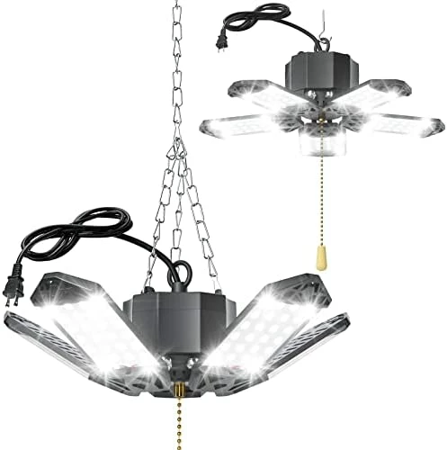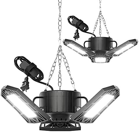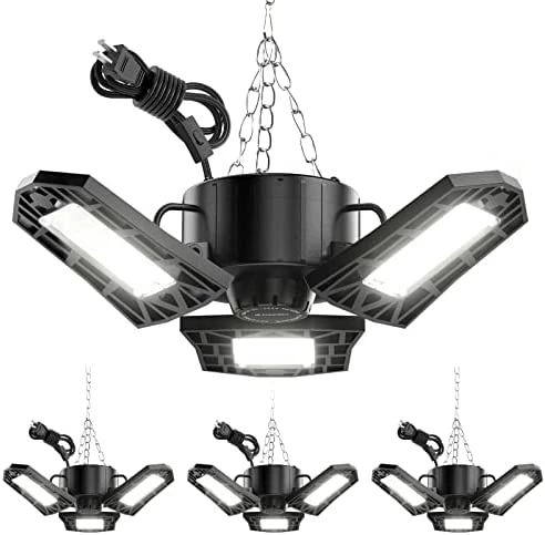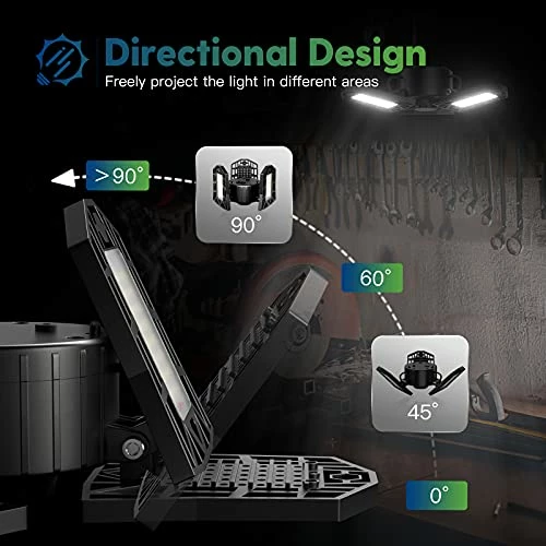 - 【Deformable Garage Lights Ceiling】3 ultra-bright panels support 0° to 90° adjustment for 270°+ coverage of lighting effects. With the adjustable height sling provided, you can make this deformable led garage light appear in the right place at the right height. Perfect solution to uneven light and inability to adjust the appropriate height.