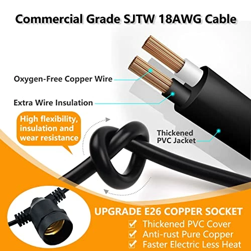 - Weatherproof and Shatterproof: Plastic bulbs assured you and your family safe while hanging the string lights for the patio, free worry from glass shards, and greatly reduce bulb change especially for outdoor use. IP65 waterproof patio string lights can withstand snow, sun, dampness, wind, rain, and extreme temperatures for outside use. Inside the E26 socket is pure copper, faster electric conduction, less heating.