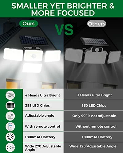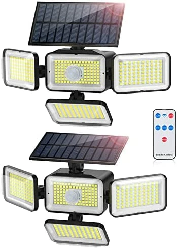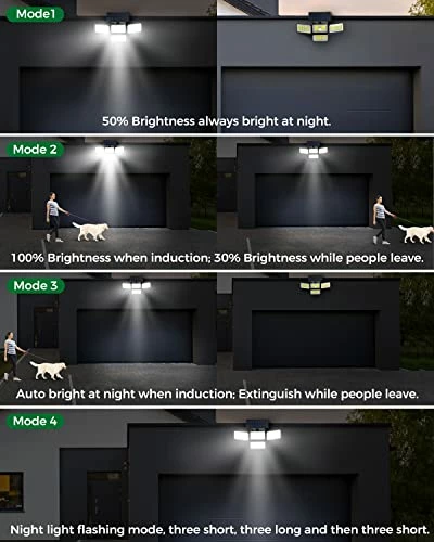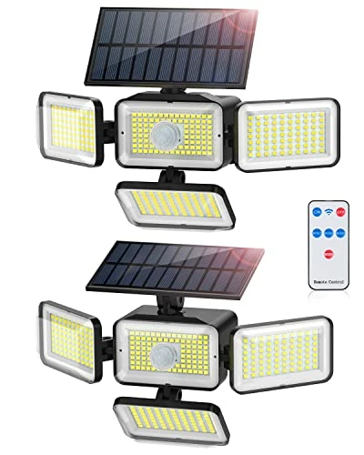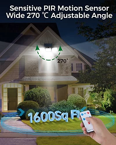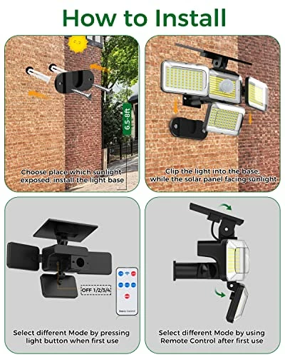 - γRemote Control & 4 Lighting ModesγThe solar outdoor lights is equipped with a wireless remote control, allowing you to select the most appropriate mode more conveniently. No longer need to take it off and set it like other solar light(you need to manually press the switch for the first time). The solar panel and spotlights can be rotated to any angle you desire.