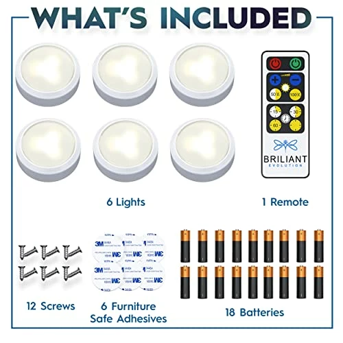 I’ve always wanted under counter lighting, but didn’t want to mess with wiring, etc. So I gave these a try. I am so impressed! Not only are the batteries included, they were already installed in each light. They come with screws or 3M sticky discs to adhere them to the bottom of the cabinets. Took me 5 minutes to install 6 lights in my kitchen. The remote control has a lot of options like timers, light brightness, etc. When I turned them on, my kitchen looked just like a magazine picture! They are beautiful. Just the right amount of light. I’m planning on ordering more!