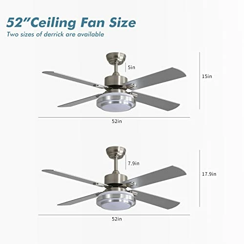 - β [Dimensions]: This ceiling fans indoor with light come with two down rods: 5 inch and 8 inch.Dimensions is 52 x 52 x 15 Inch or 52 x 52 x 18 Inch depend on which rod you choose.Ceiling fan with remote has double-faced white/silver blades.